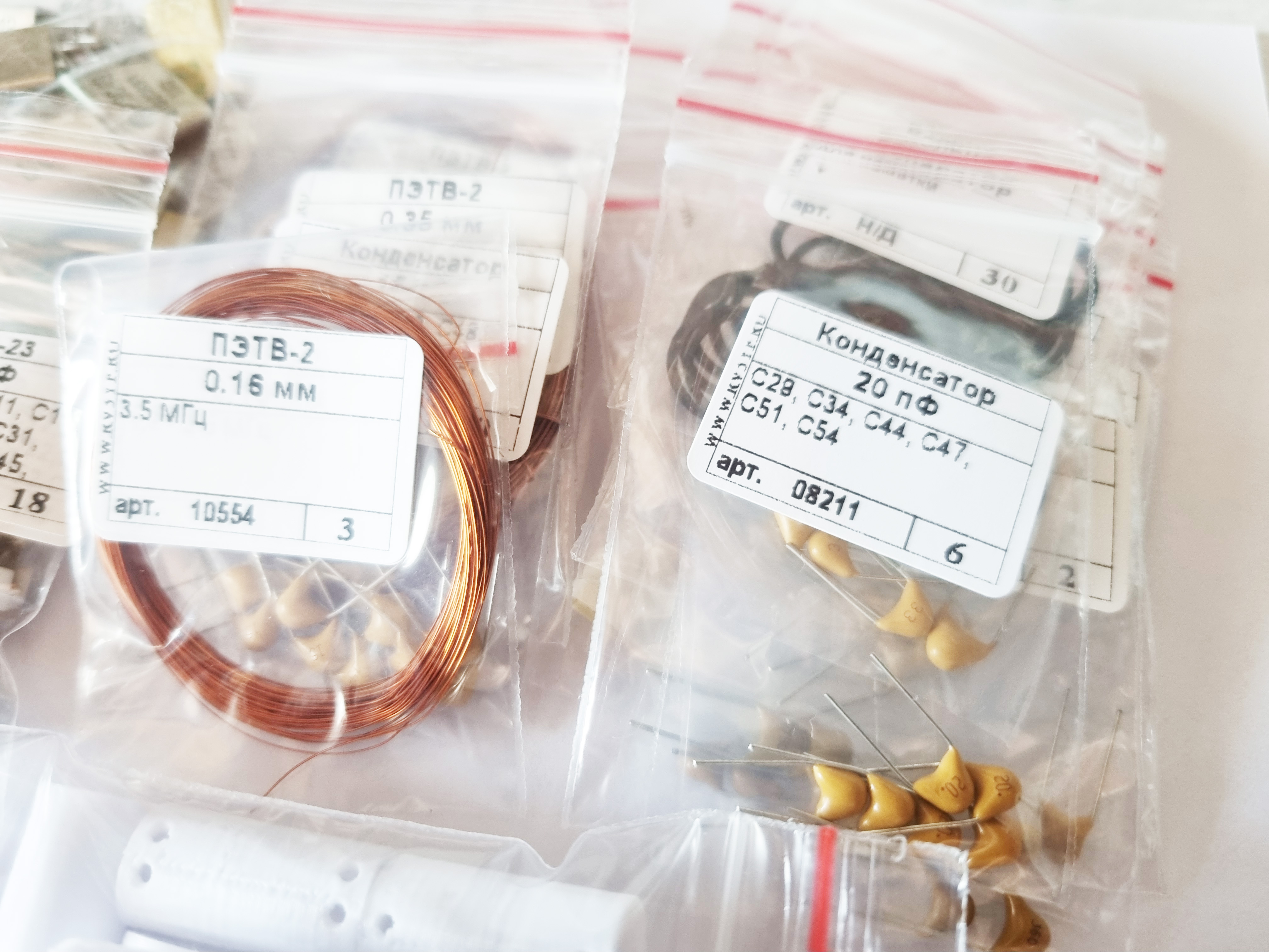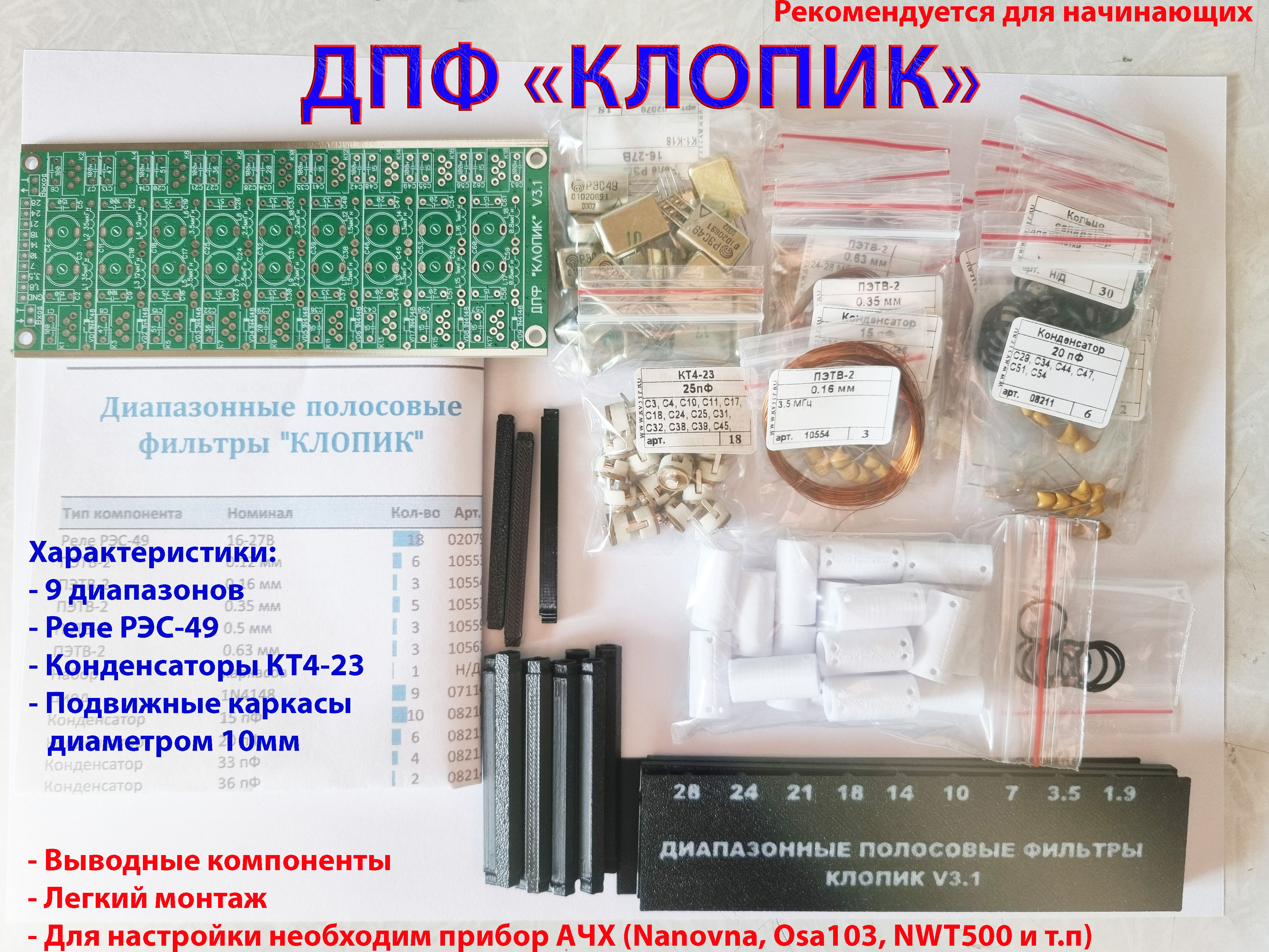 Состав набора: документация, печатная плата, реле РЭС-49 (РЭК-23) для переключения диапазонов на 16-27В, конденсаторы, каркасы контуров, провод.