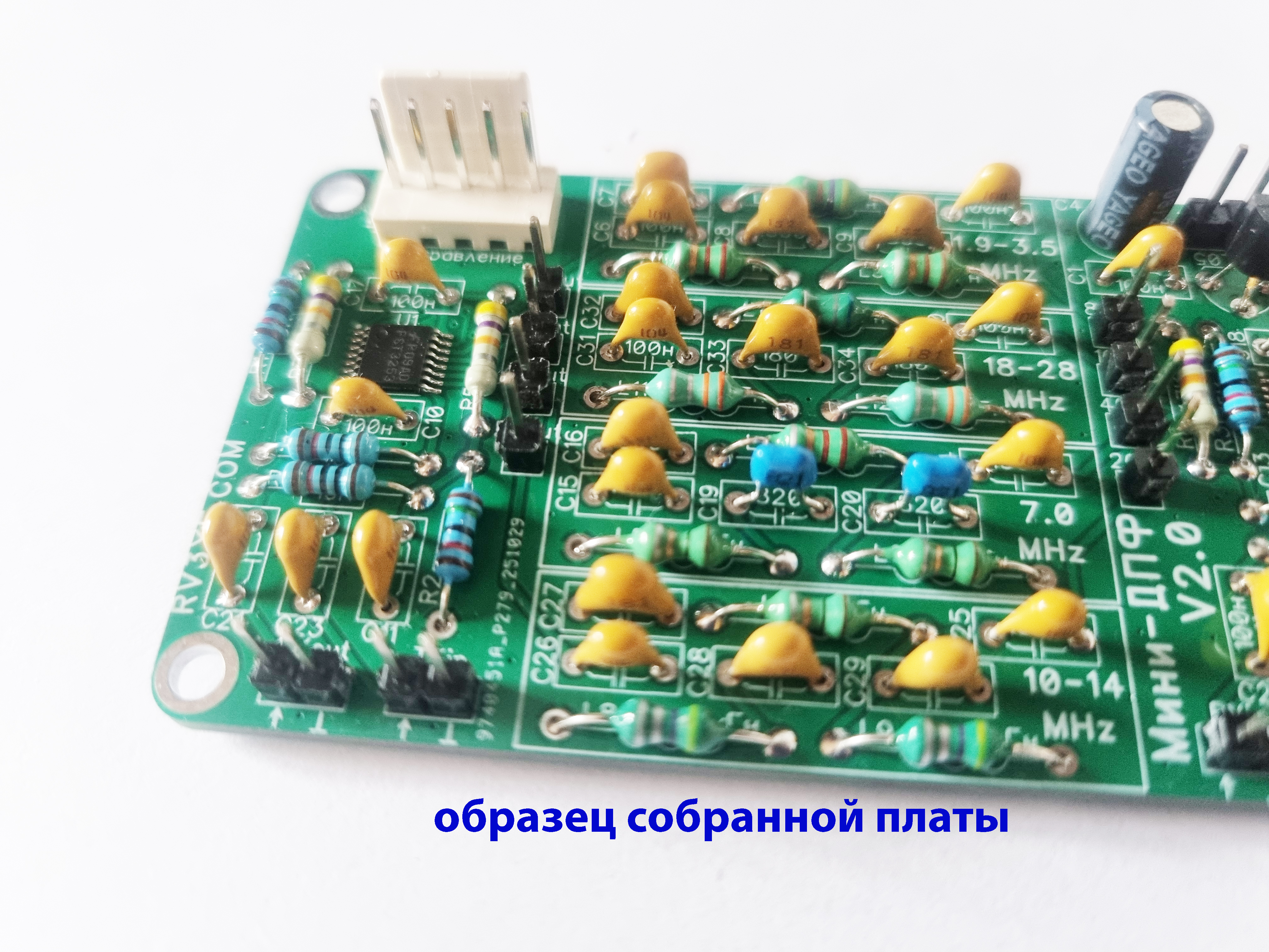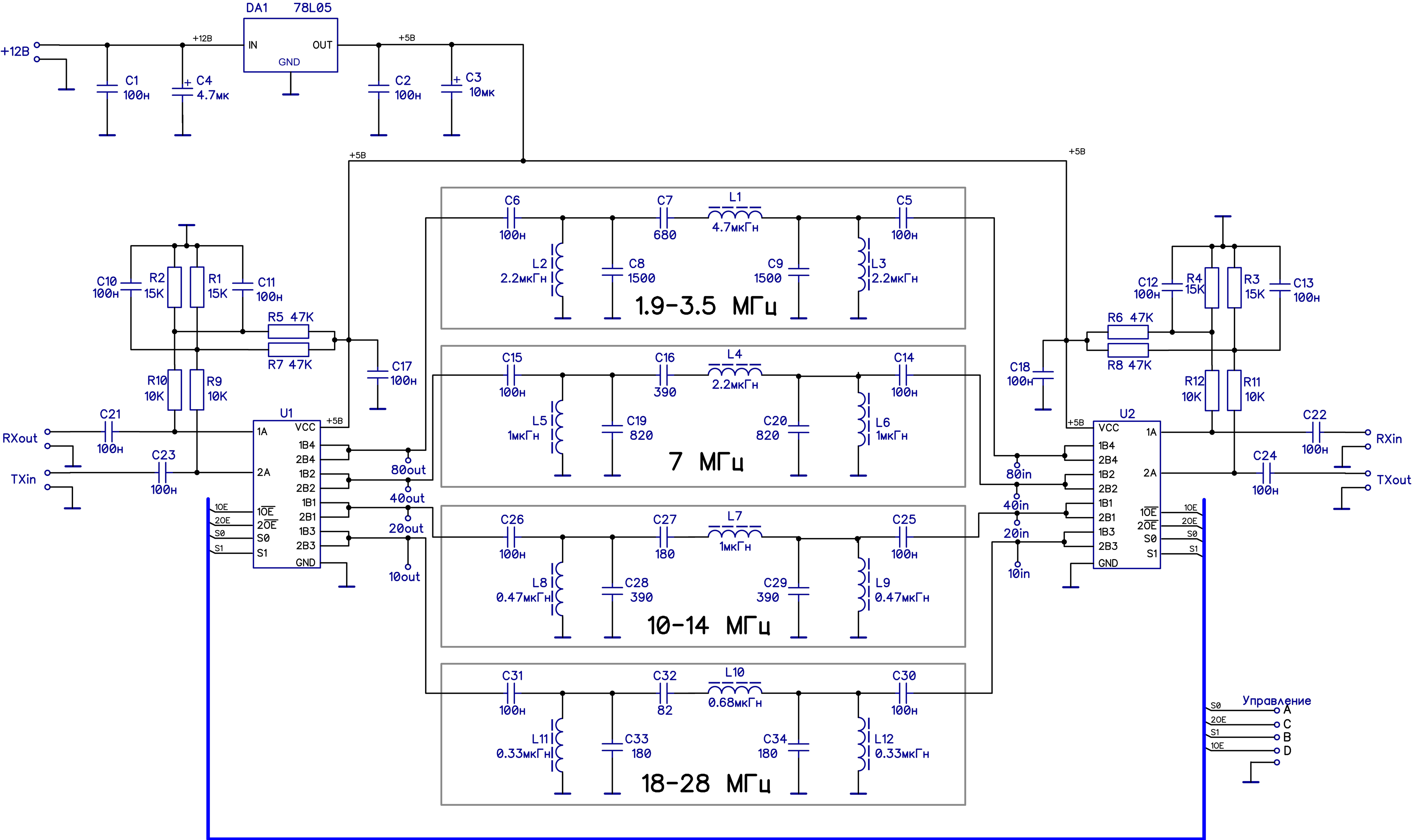 Четыре полосовых фильтра используются в тракте RX и TX для покрытия всех КВ-диапазонов (1.9-3,5МГц; 7 МГц; 10-14 МГЦ, 18-28 МГц). Фильтры реализуются с использованием стандартных значений конденсаторов и индуктивностей. Переключение диапазонов фильтра достигается с помощью переключателей SN74CBT3253, два из них: один на входе и один на выходе для предотвращения перекрестных помех. Для управления используются две параллельные линии данных, а также линии TX и RX, которые выбирают режим приема или передачи. Это один из самых простых, компактных и простых в построении фильтров, не уступающий фильтрам других конструкций. Данная конструкция хорошо зарекомендовала себя в импортных трансиверах.